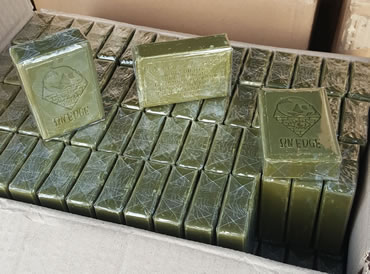 Olivgrüne Seife mit Namen oder Logo bedruckt.